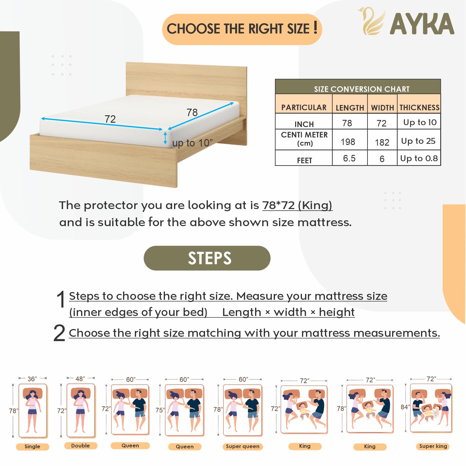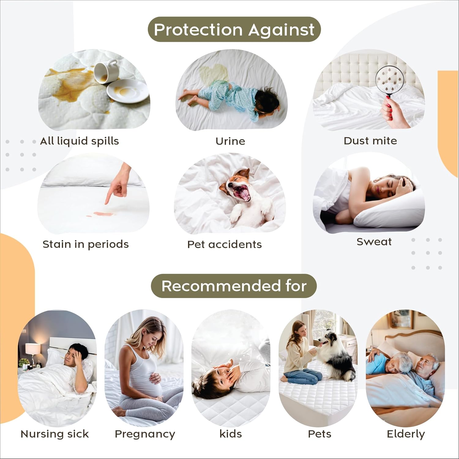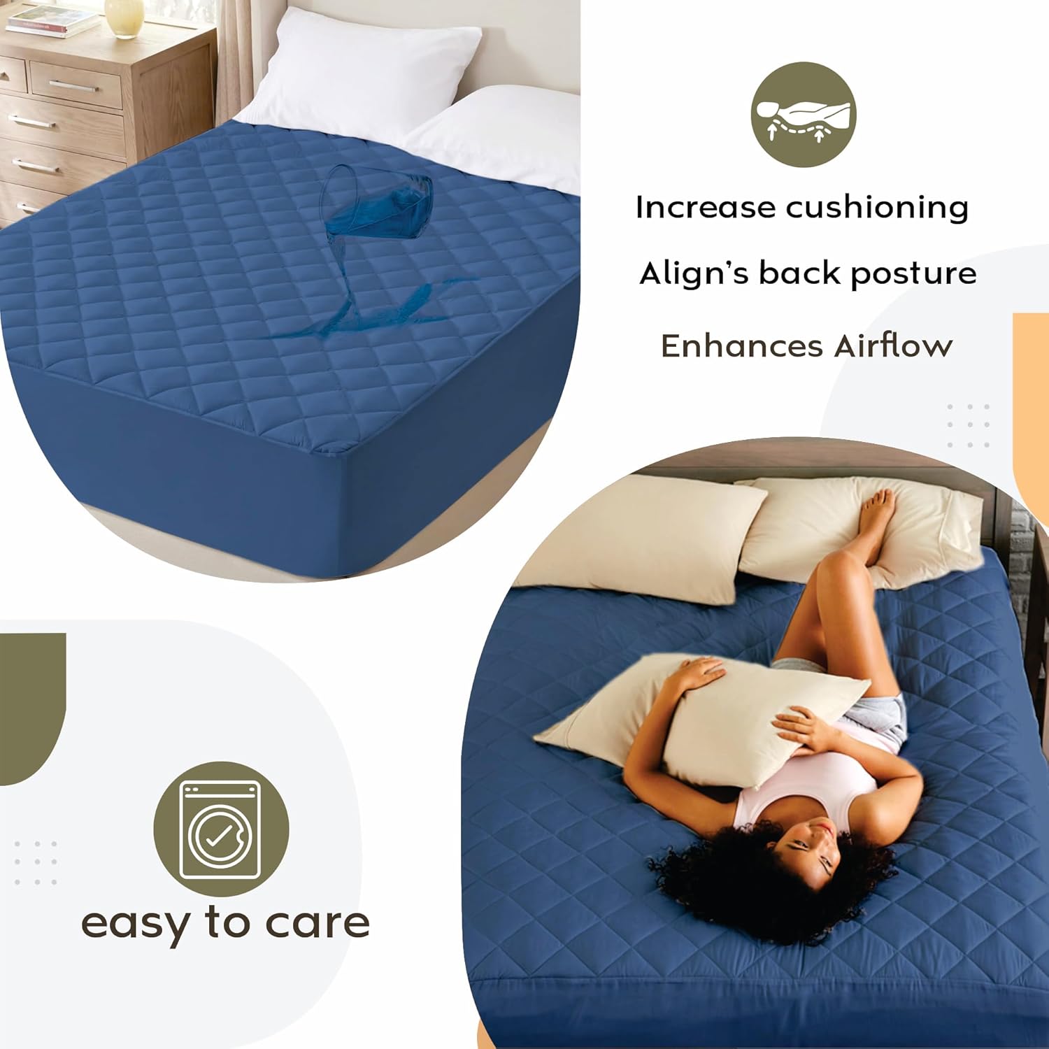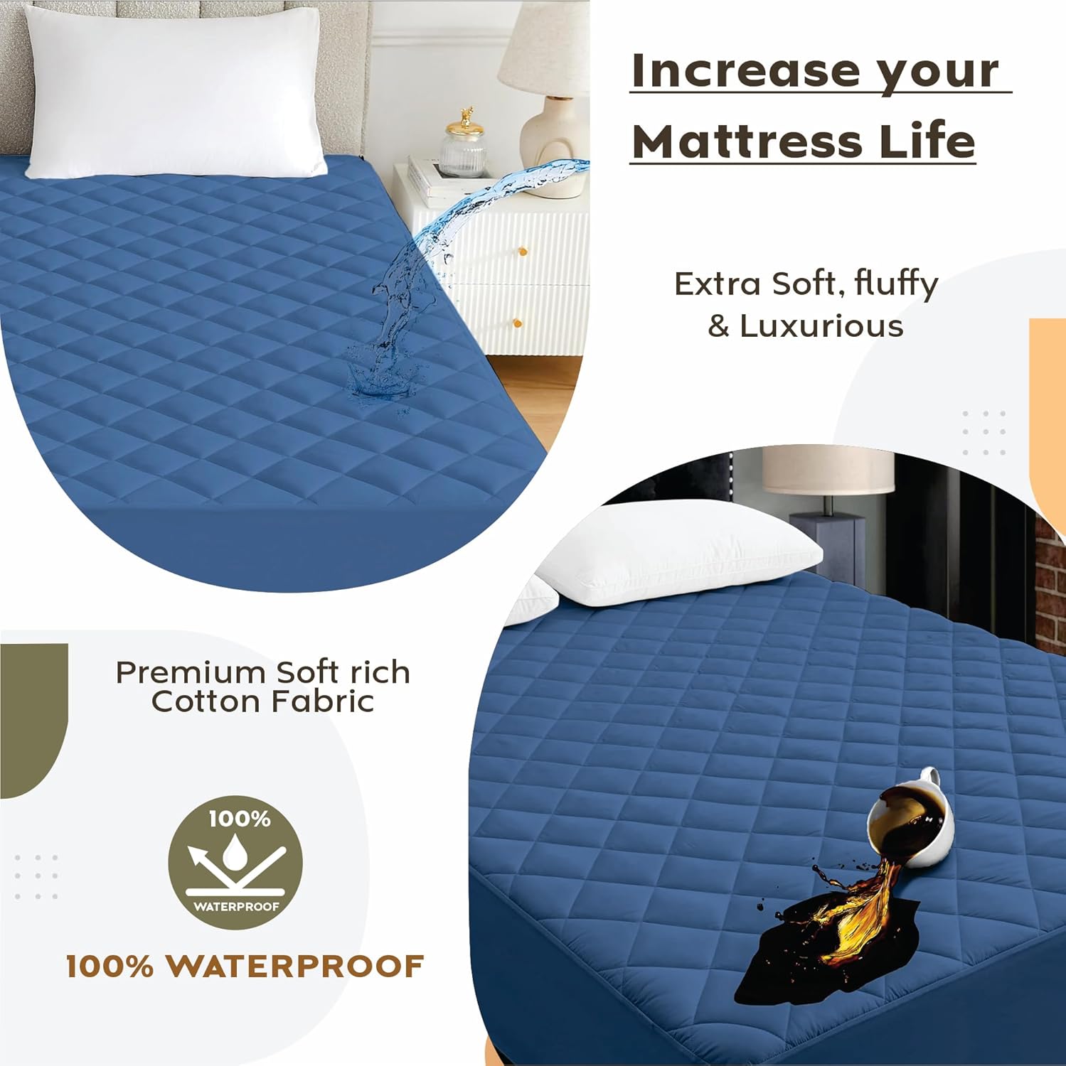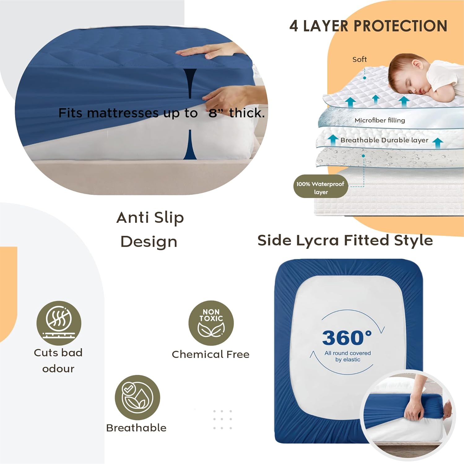 The Ayka 100% Waterproof Cotton Quilted Mattress Protector is designed to provide a comfortable and protective layer for your mattress. Made from premium quality cotton-rich fabric, this protector is ultra-soft and breathable, ensuring a pleasant sleeping experience. Its 150 GSM quilted sheets offer increased cushioning, making your bed feel cozier. Additionally, it is noiseless, allowing for a peaceful night's sleep without the crinkling sounds often associated with plastic protectors.