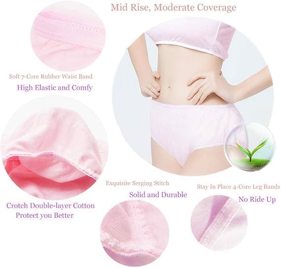 The Bennort Cotton Disposable Underwear for Women is designed for comfort and convenience in various situations. Made from 100% cotton, these soft and breathable panties feature a double-layer crotch for added protection. The mid-rise style offers moderate coverage with a gentle 7-core rubber waistband that ensures a secure fit without digging into the skin. Each pair is individually wrapped, making them hygienic and easy to carry, perfect for travel, hospital stays, or postpartum recovery.