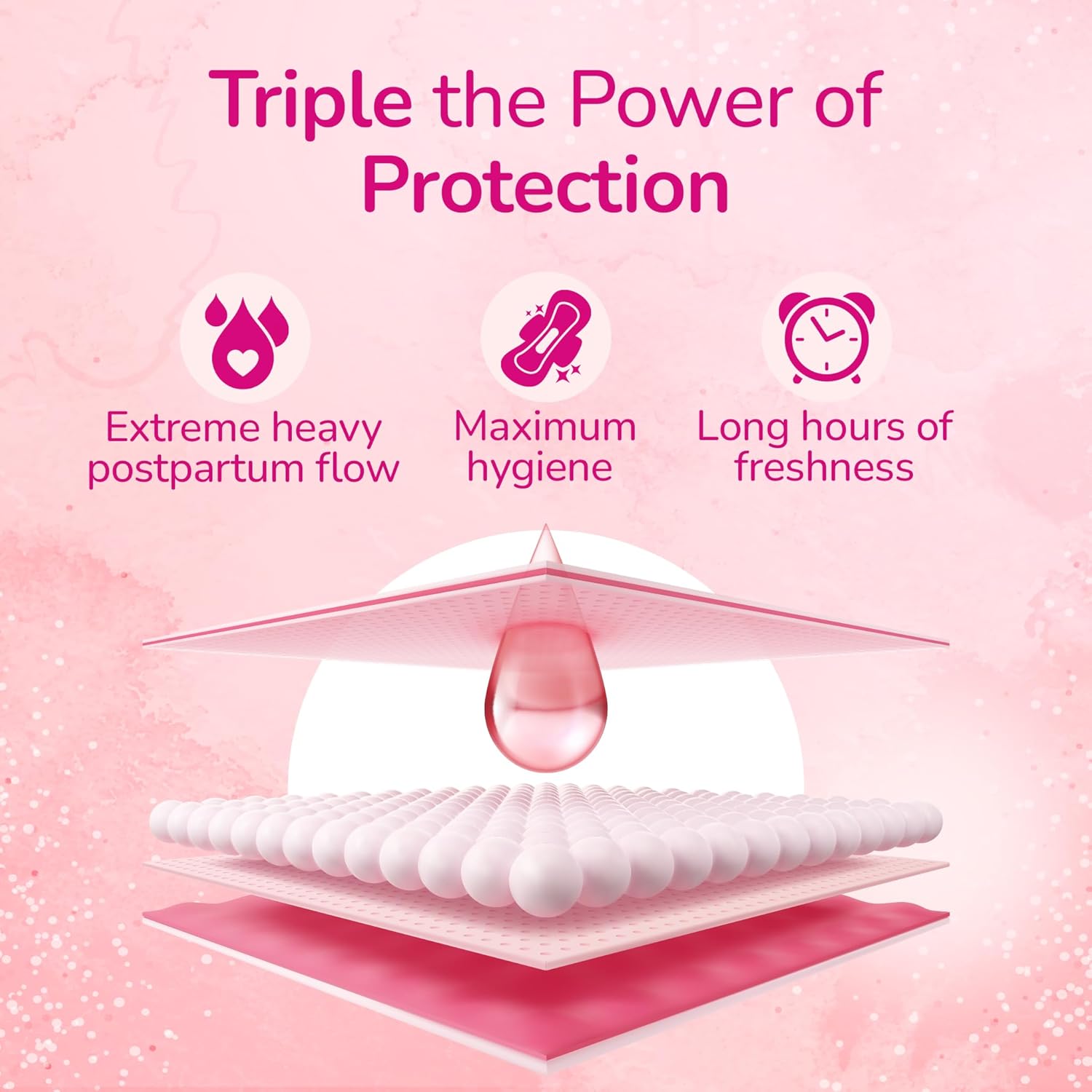 Evereve Maternity Pads XXXL+ 420mm are specifically designed for new mothers, providing the widest front-to-back leakproof coverage for maximum safety. With 3X absorbency, these pads effectively manage heavy postpartum bleeding and clots, ensuring comfort and hygiene during recovery. Made from soft and breathable materials, they are irritation-free, allowing for all-day comfort. Each pack contains 10 pads, making them ideal for both hospital use and after-birth care at home.