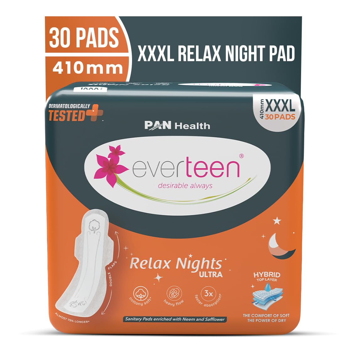 everteen Relax Night 30 XXXL Ultra Thin Sanitary Pads for Women, For Super Heavy Flow with Wider Back, Front to Back Coverage, Upto 12 Hours of Absorption, Maternity Pads, Pack of 1 (410mm)