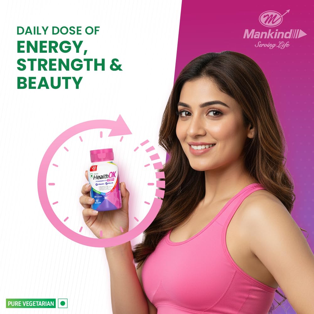 Mankind Health OK Women Multivitamin 30 Tablets – Strawberry Flavour, Pure Vegetarian, 19+ Essential Vitamins & Minerals with Biotin & Ginseng | Hair Skin Nails, Energy & Bone Health Support