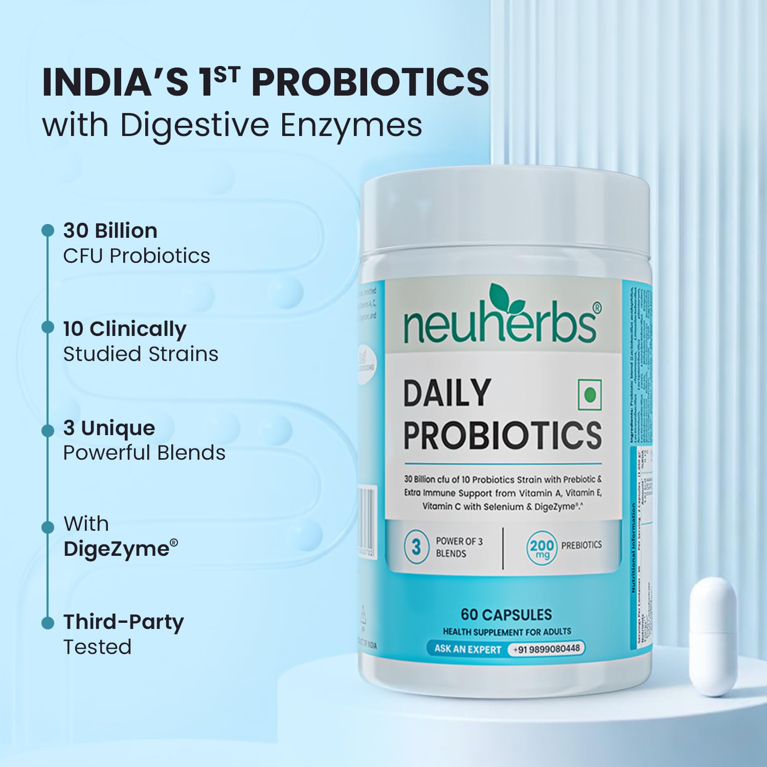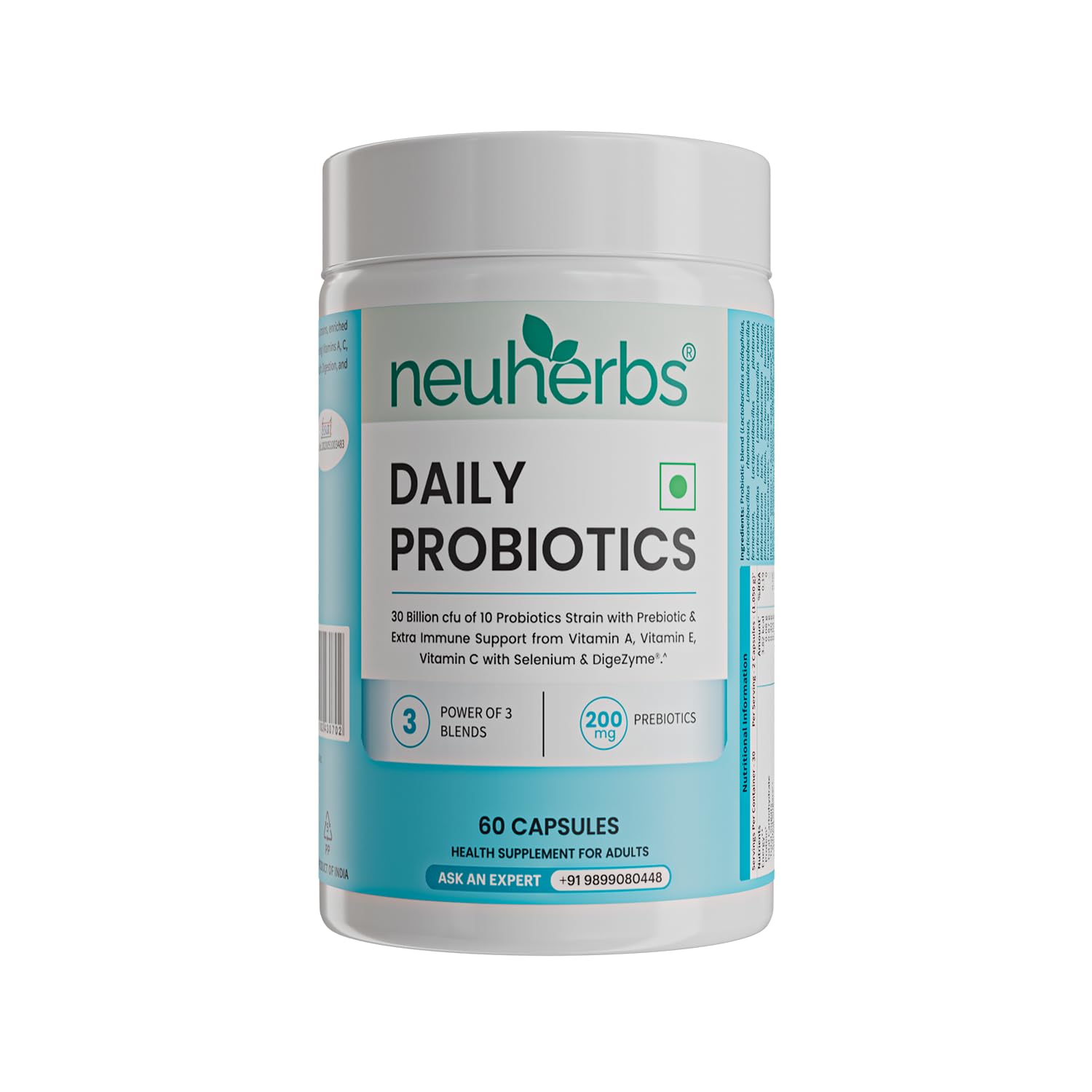 Neuherbs Daily Probiotics offer a blend of 30 billion CFU with prebiotics, designed to support gut health and digestion. These capsules are enriched with vitamins A, C, and selenium, which may aid in boosting immunity. The multi-strain formula is crafted to help with bloating relief and overall digestive wellness.
