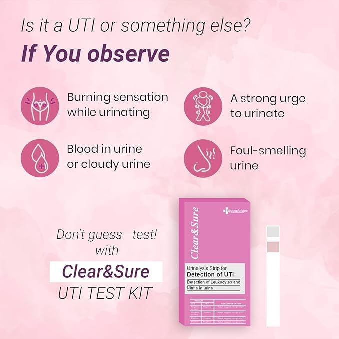 Recombigen's Clear and Sure Peace of Mind UTI Rapid Test Kit offers a straightforward solution for at-home urinary tract infection screening. With this kit, you can quickly check your health without the need for a clinic visit. The process is simple: dip the test strip, wait for the results, and match the color to the provided guide. This technology mirrors what is used in clinical settings, ensuring reliable results. The kit is designed to be safe and sanitary, featuring non-invasive, individually sealed test strips.