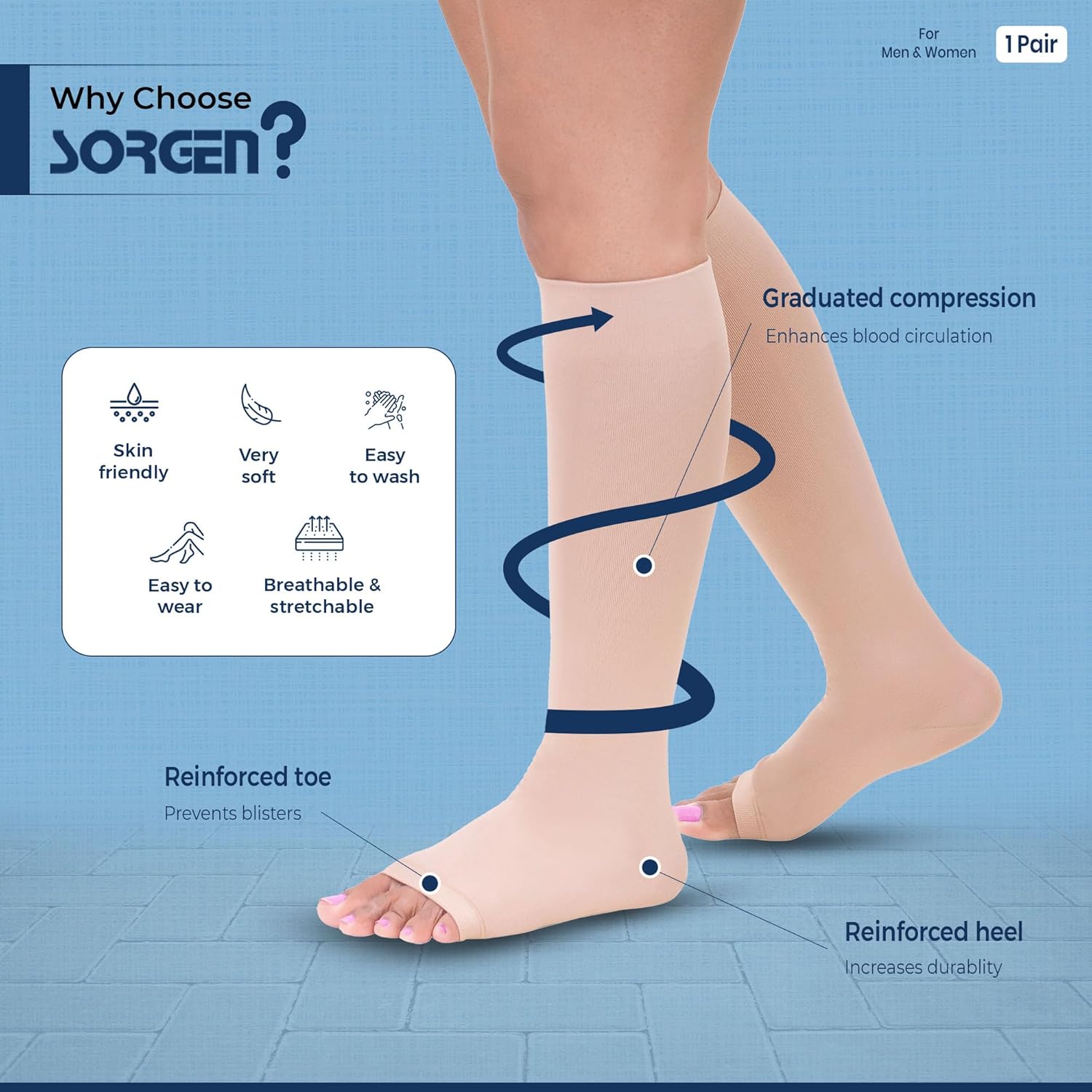 Sorgen Class I Medical Compression Stockings for Varicose Veins | Class 1 Knee Length stockings | Below Knee Class I Compression Socks | 18-21 mm Hg pressure stockings