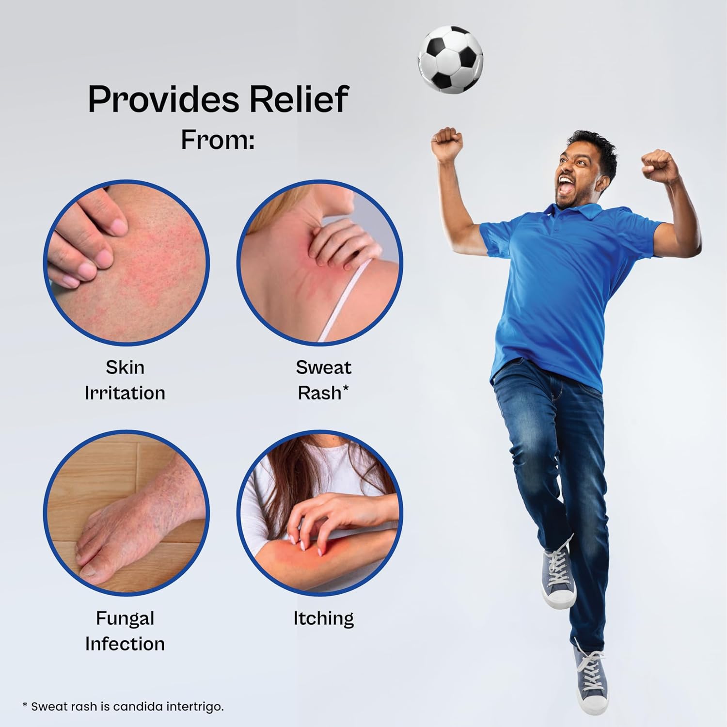 It is used to manage fungal skin infections, particularly those caused by moisture accumulation in skin folds, and to relieve sweat-induced rashes, itching, and skin irritation.