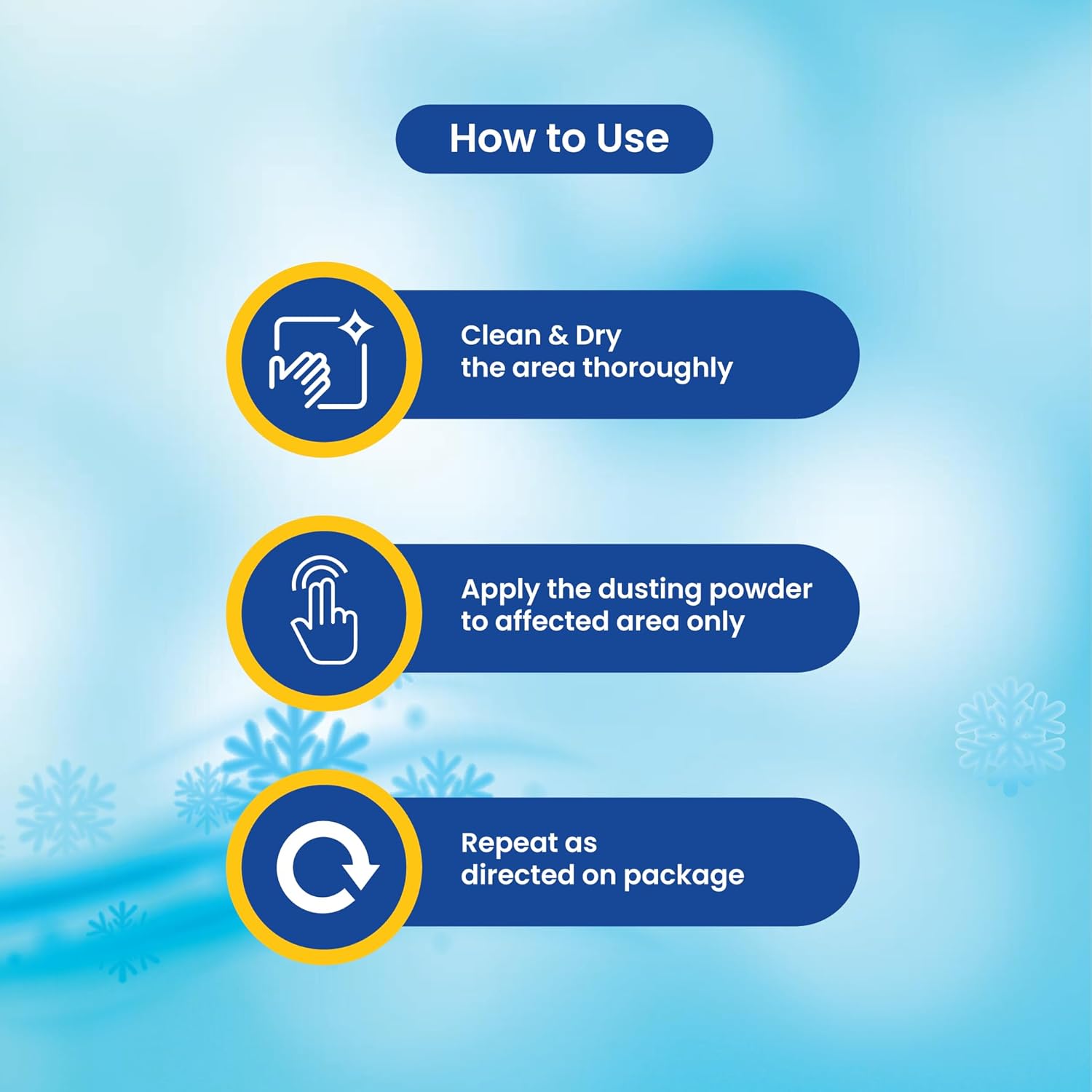 Apply the dusting powder to the affected area only, and repeat 2-3 times a day for 2-4 weeks to effectively treat the infection.