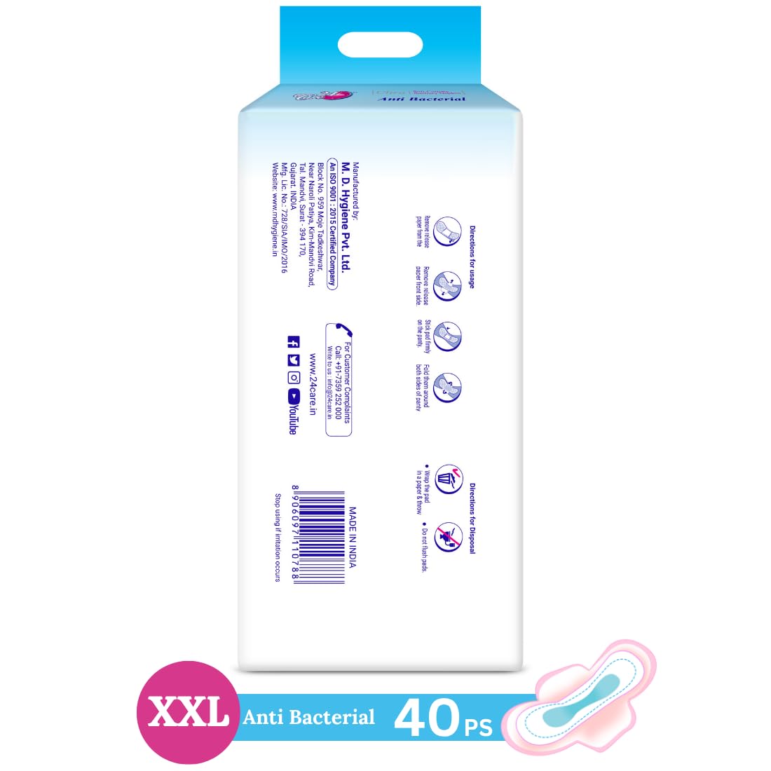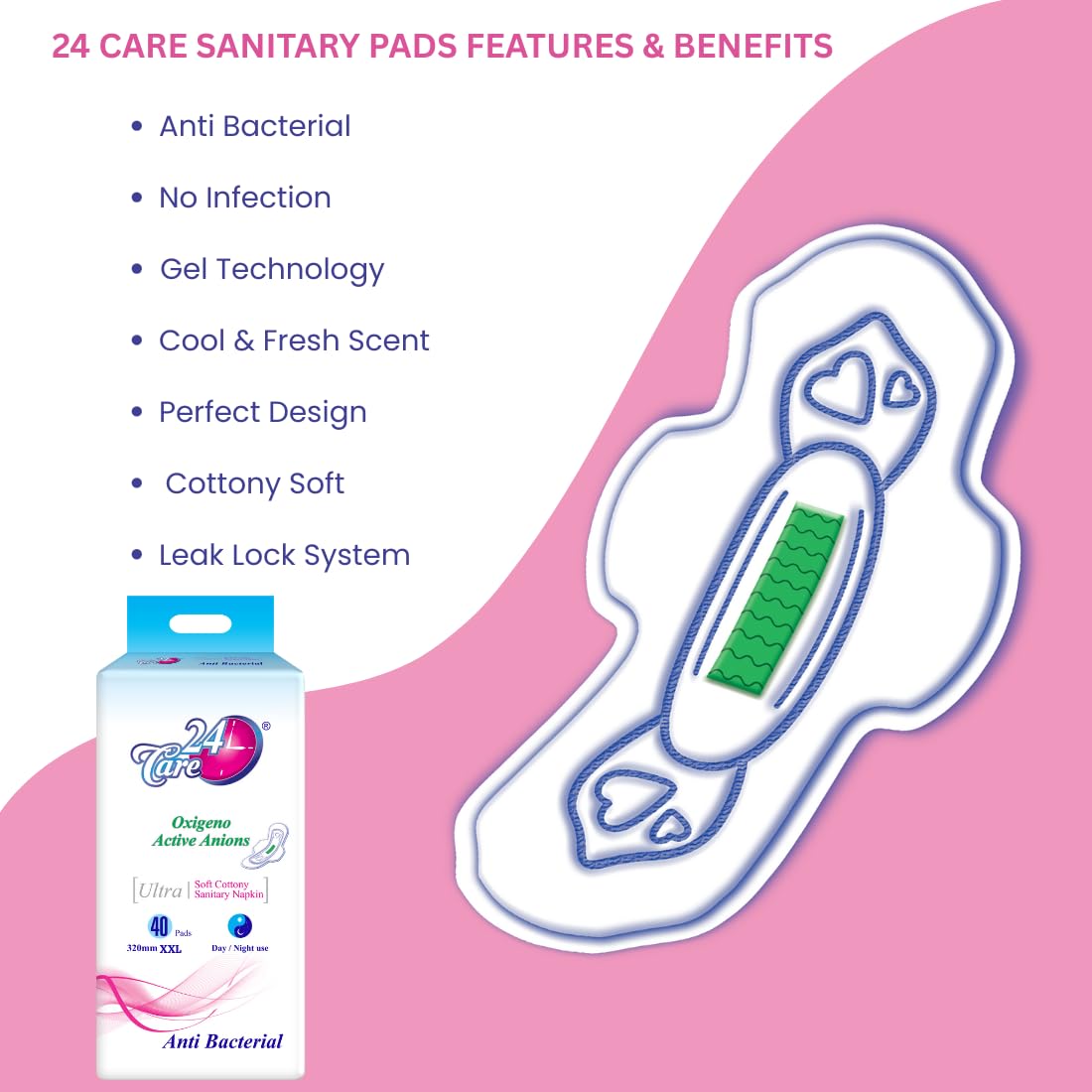 The Ultra Sanitary Pads Combo Pack includes 8 XL and 40 XXL pads designed for heavy flow. These pads utilize anti-bacterial properties and oxygen anion technology, ensuring a hygienic experience. The extra-long design provides added coverage for overnight use, making them suitable for those who need reliable protection while sleeping.